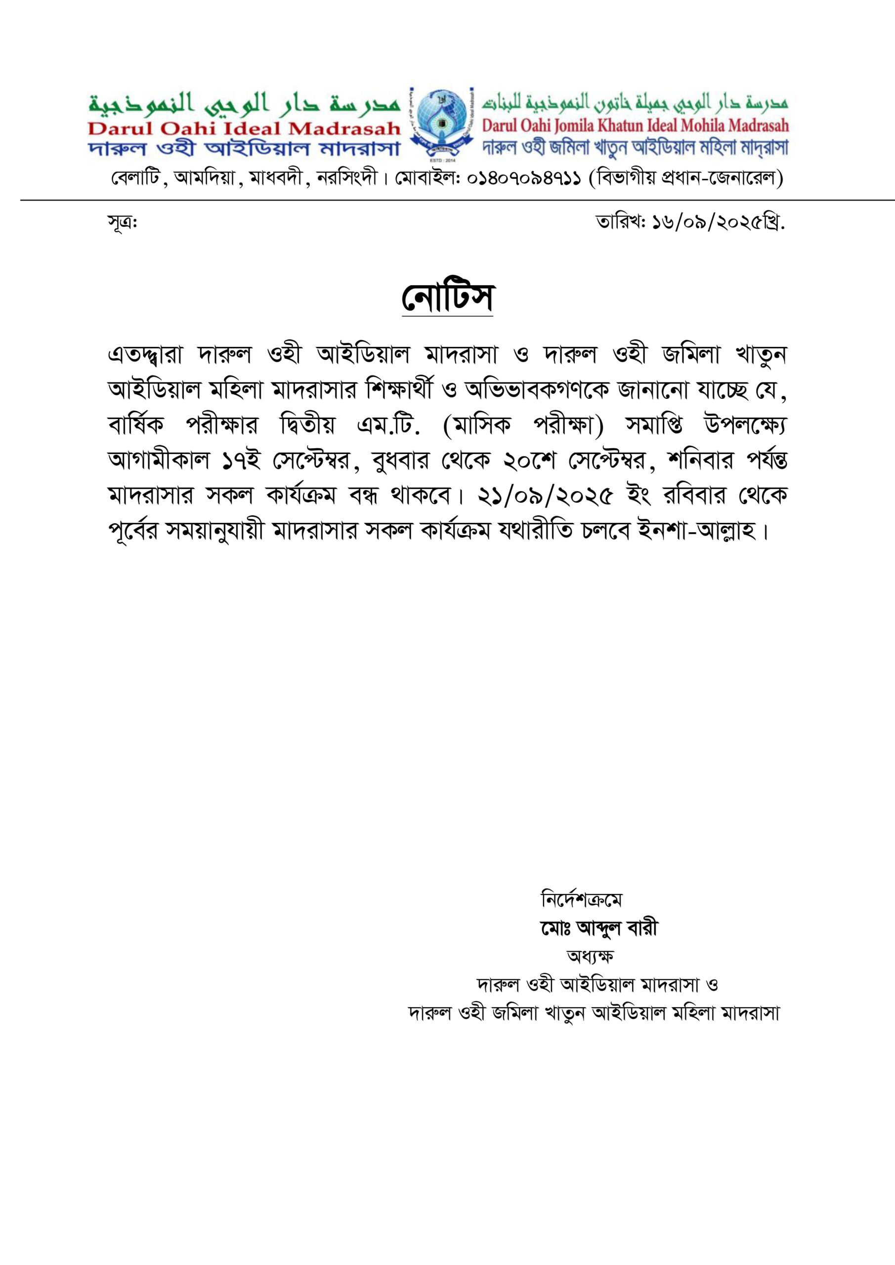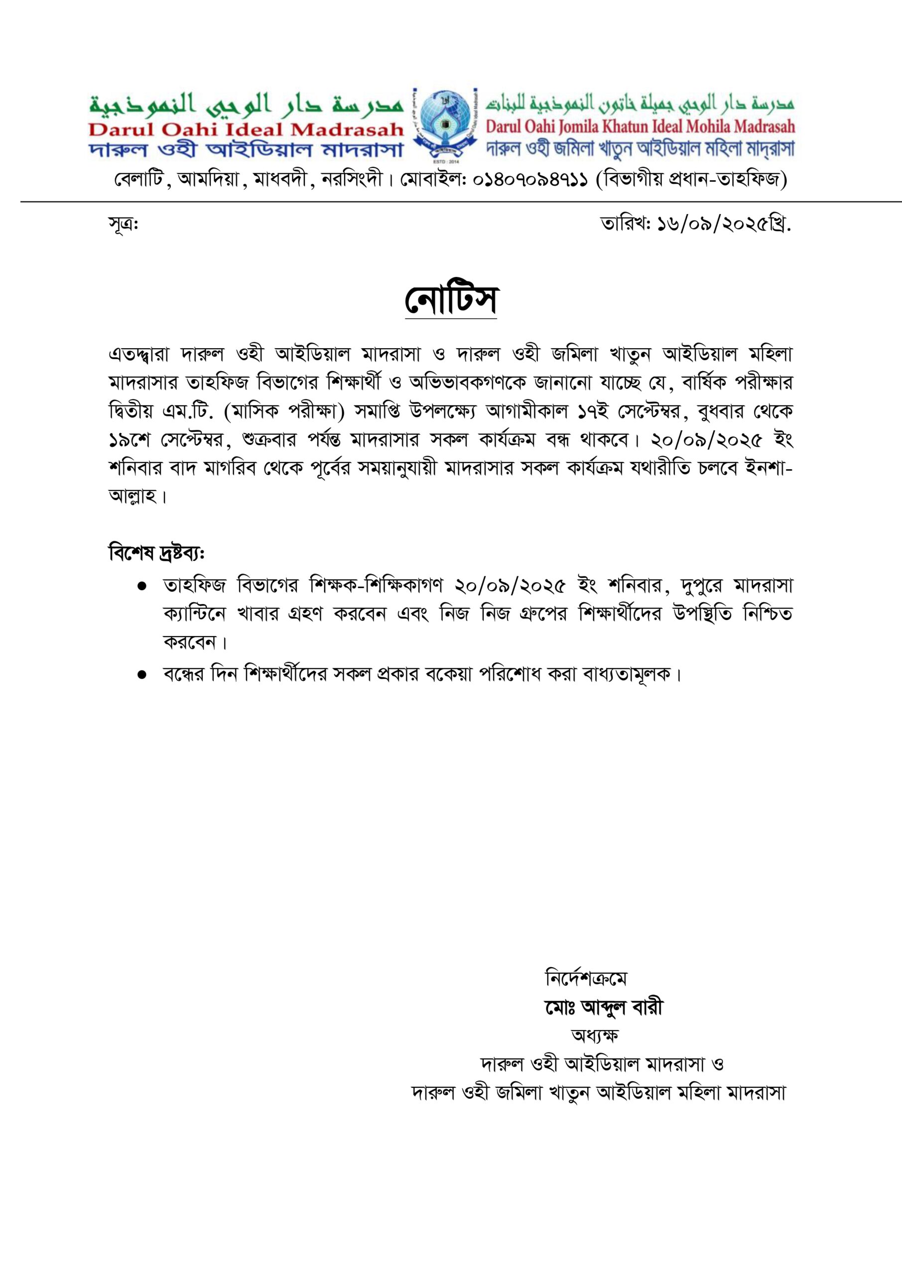 এম.টি পরীক্ষা সমাপ্তি উপলক্ষ্যে জেনারেল ও তাহফিজ বিভাগের ছুটি সংক্রান্ত নোটিস!