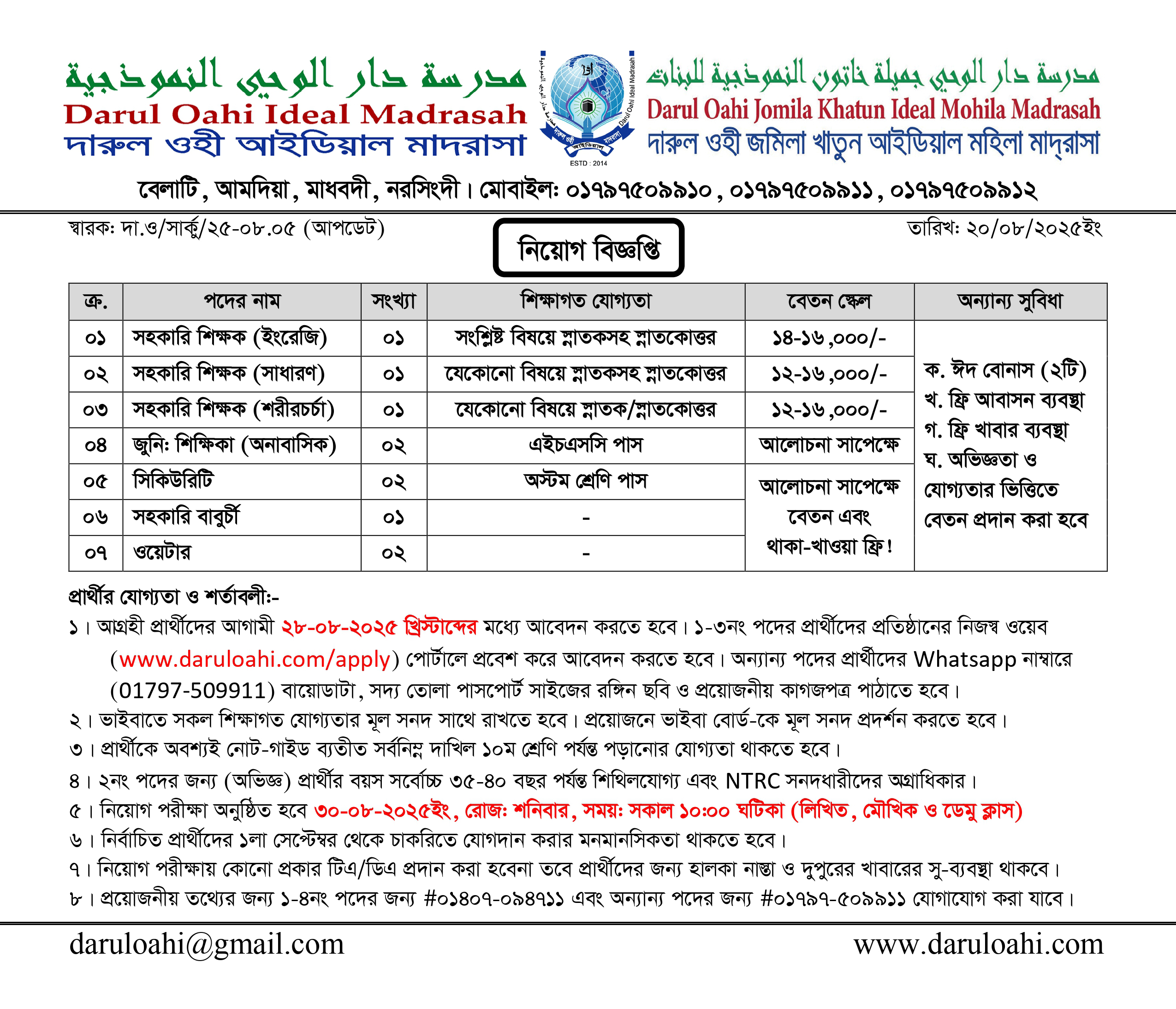 সহকারি শিক্ষক, জুনিয়র শিক্ষিকা, সিকিউরিটি, সহ: বাবুর্চি ও ওয়েটার পদে নিয়োগ বিজ্ঞপ্তি প্রকাশ!